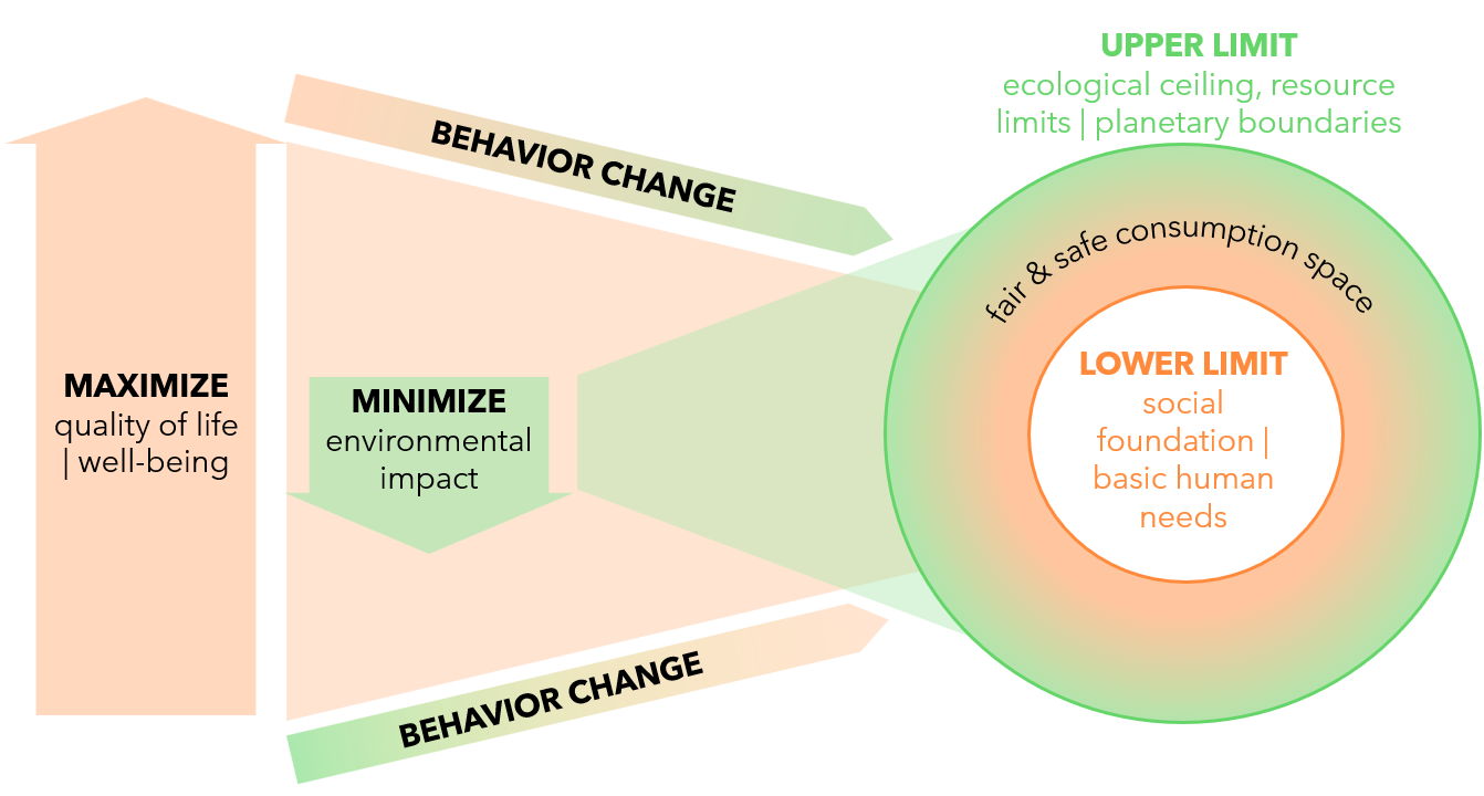 In the 2010s, the focus moved from changing individual behaviors to lifestyles. The Paris Agreement brought the understanding that 1.5°C lifestyles must ensure maximum well-being with minimal environmental and social impacts (see Well-being Economy). The new focus moved beyond efficiency and shift strategies toward sufficiency strategies. These aim at (i) staying below planetary boundaries by minimizing environmental impact and (ii) staying above minimum social thresholds of basic human needs satisfaction by maximizing quality of life (Figure 9.1; see Consumption Corridors, Doughnut Economy, Fair Consumption Space).