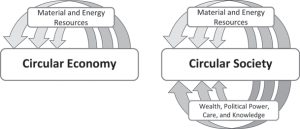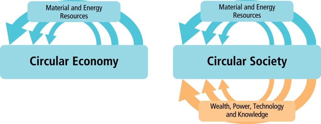 In the last decade, the concept of the circular economy (CE) has emerged as a major discourse on sustainability in policy, business, NGO, and academic domains. While the concept of the circular economy (CE) continues to evolve, encompassing a plurality of approaches, the main idea is to optimize the use of the Earth’s natural resources to meet human needs in a sustainable, resilient, and regenerative manner. CE thereby seeks to create a balanced and harmonious flow of socio-ecological resources between human and natural ecosystems so humanity may thrive within planetary boundaries. There are two broad conceptualizations of circularity: a CE, which only seeks to circulate material and energy resources sustainably, and a Circular Society (CS), which also seeks to circulate wealth, political power, care, and knowledge (including technologies) in a democratic and redistributive manner (see Figure 49.1).