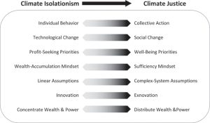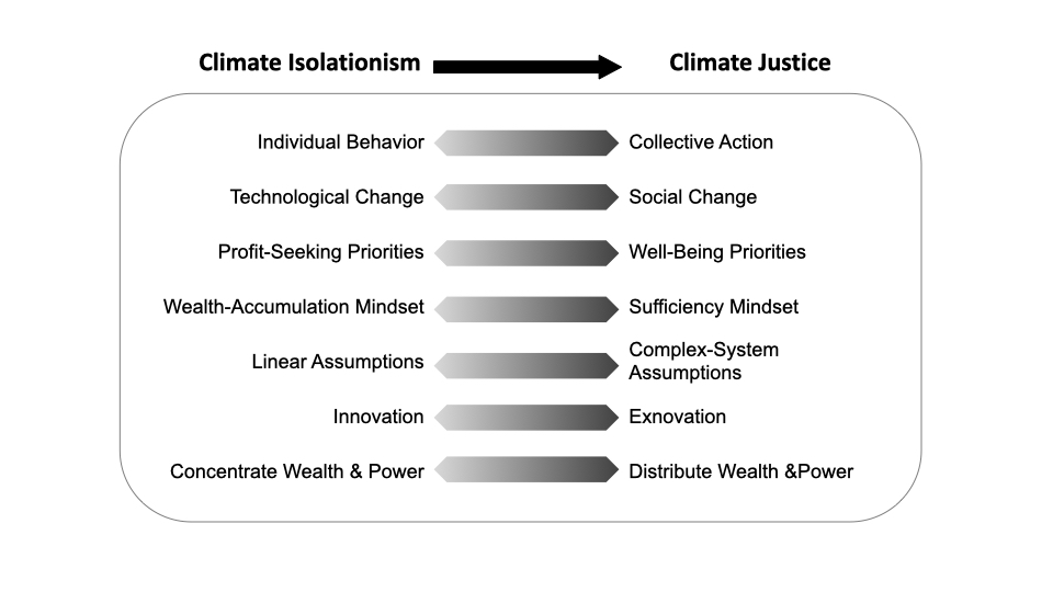 Climate justice is increasingly recognized as a necessary paradigm shift, given the ineffective and insufficient mainstream approach to climate policy, often pushing technological solutions that are non-transformative and benefiting those who are already privileged. It breaks from approaching climate policy through a narrow “climate isolationism” lens that focuses on individual behavior, technological change, profit-seeking, a wealth-accumulation mindset based on linear assumptions, and innovation that concentrates wealth and power (see Figure 39.1)