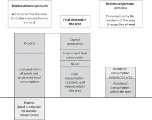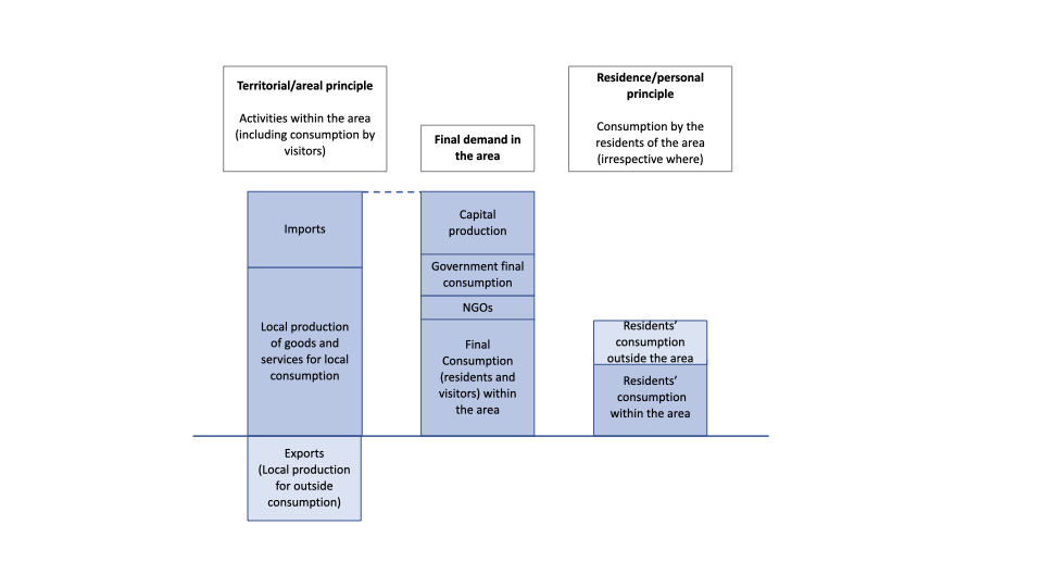 Figure 85.1 shows how the territorial/areal principle captures the global impact of the area in question, and how that matches with final demand in the area, whereas the residence/personal principle captures the global impact caused by the residents of the area in question.