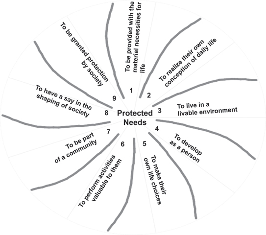 The Theory of PN provides a list of universal (and not hierarchical) needs. These needs are called protected because they claim to be (1) needs that deserve special protection within and across societies since they are crucial to human well-being, and they claim to be, at the same time, (2) needs for which special societal protection is possible since they are needs that a government or community can reasonably be made responsible for. The Theory of PN proposes nine universal needs. Each is specified by a thick description. The needs denote what individuals must be allowed to want (Figure 30.2), and the thick descriptions describe the possibilities individuals should be provided with. Concurring with a needs approach, the nine needs are ends in themselves. That is, they cannot be further reduced and they are non-substitutable. The nine needs are context-sensitive despite being universal: the thick descriptions serve as a starting point for their cultural and historical adaptation. Empirical evidence shows that these needs resonate in different cultural contexts.