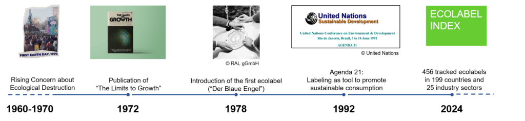 In Agenda 21, participants in the UN Earth Summit in Rio de Janeiro (1992) described environmental labeling as an important instrument for promoting sustainable consumption and production by making it easier for consumers to buy resource-efficient and environmentally friendly products. Since then, ecolabels have proliferated. In 1992, for example, the European Commission decided to introduce the EU Ecolabel for the entire European market. At the same time, however, criticism of the actual effectiveness of ecolabels in reducing the environmental and social impact of consumption has steadily increased. According to the Ecolabel Index (2024), there are currently 456 ecolabels informing consumers from 199 countries about products and services in 25 sectors, such as fashion, tourism, and food. Figure 78.1 shows these milestones in the history of ecolabeling.