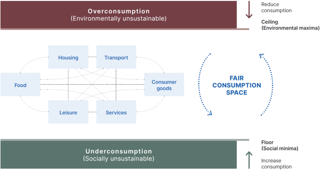 - Well-being: This means that the transformations required to live within the fair consumption space are guided by the well-being of individuals, society, and wider ecologies, rather than other metrics such as economic growth (see e.g., Well-being Economy).