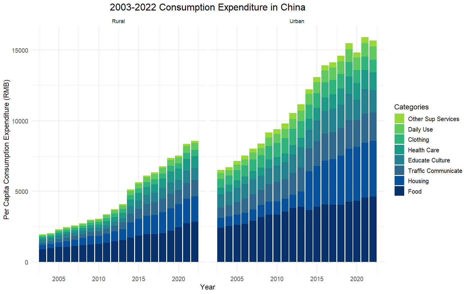 In the 21st century, China’s household consumption expenditures have increased significantly, driven by rapid economic growth. The internet and the rise of social media had a profound impact on consumption patterns and lifestyles, accelerating the shift to mobile payments and making online shopping more convenient (see Information and Communication Technology, Money). As shown in Figure 6.1, between 2003 and 2022 urban household expenditures increased about 2.5 times, and rural household expenditures grew by approximately 4.5 times. However, this also raises concerns about overconsumption and environmental sustainability (Liu et al., 2016).