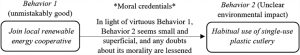 Moral licensing, also known as self-licensing, occurs when previous virtuous or moral behaviors make individuals feel entitled to act in a way they would not permit themselves otherwise. This sense of entitlement to engage in behaviors normally considered unethical is a psychological mechanism that arises when individuals’ prior virtuous actions enhance their self-image, making them feel good about themselves. As a result, individuals allow themselves to act in a less virtuous way without feeling guilty or compromising their image as a moral person. When pro-environmental behavior is seen as a virtuous act, it can lead to moral licensing in subsequent decisions.