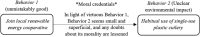 | Behavior 1 (Transport) | (+) Mindful use of heating | (-) Excessive use of heating | |
