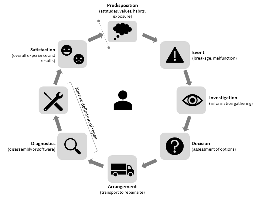 With repair commonly defined narrowly as diagnostics and repair, Figure 11.1 takes a more comprehensive view, depicting repair as a diverse multi-step process. It is rarely as linear as depicted: depending on the outcomes at each stage, it might be necessary to return to previous stages, such as when the “Diagnostics” stage points to an issue that the repairer is unable to fix or the appliance does not fit into a person’s car at the “Arrangement” stage – both requiring a return to the “Investigation” stage to explore other options. Depending on the conditions encountered at each stage (e.g., an individual’s predispositions, the cost of repair, and product design), the repair effort either progresses to the next stage or ceases.
