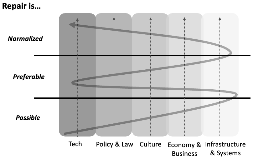 The Right to Repair legislative framework primarily addresses the first level of possibility to upscale repair activities. However, additional measures are needed to reposition repair as a central activity within a sustainable, circular, and sufficient society (Figure 11.2) – via preferability and normalization – which are largely missing from the current focus on a Right to Repair. The shifting of consumer behaviors and attitudes requires, at a minimum, increased public awareness of the benefits of repair and assurance of lower-friction opportunities and incentives to engage in the practice (Figure 11.1).