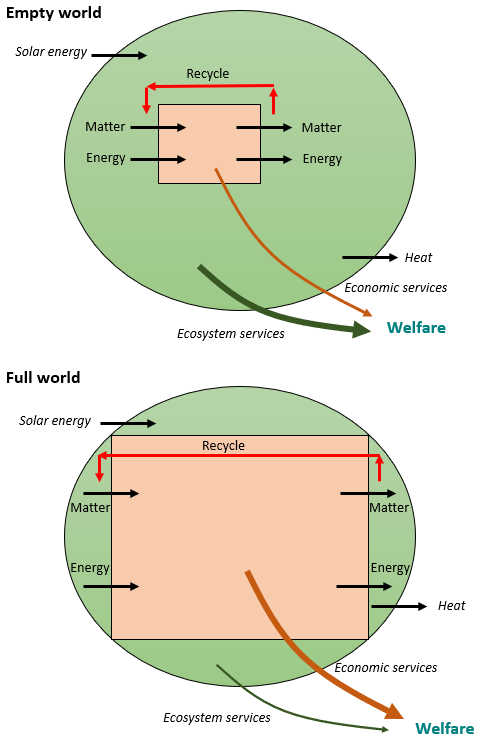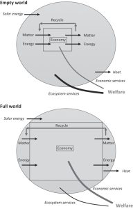 Daly’s idea was to constrain the stocks of population and artifacts to reduce the demands we put on the planet. Humans and our belongings are created using materials and energy and require a continual stream of materials and energy to function. When these stocks are growing, then the flow of energy and materials required to create and sustain them must also grow, leading to resource depletion and exhaustion (see Box 44.1 and Figure 44.1). Growing stocks of people and artifacts also lead to growing levels of waste and pollution that overwhelm Earth’s assimilative capacity, creating problems such as climate change, acid rain, ozone depletion, and the eutrophication of water bodies. (See Figure 44.1 where a growing “full-world” economy takes up much more of the ecological carrying capacity of the planet).